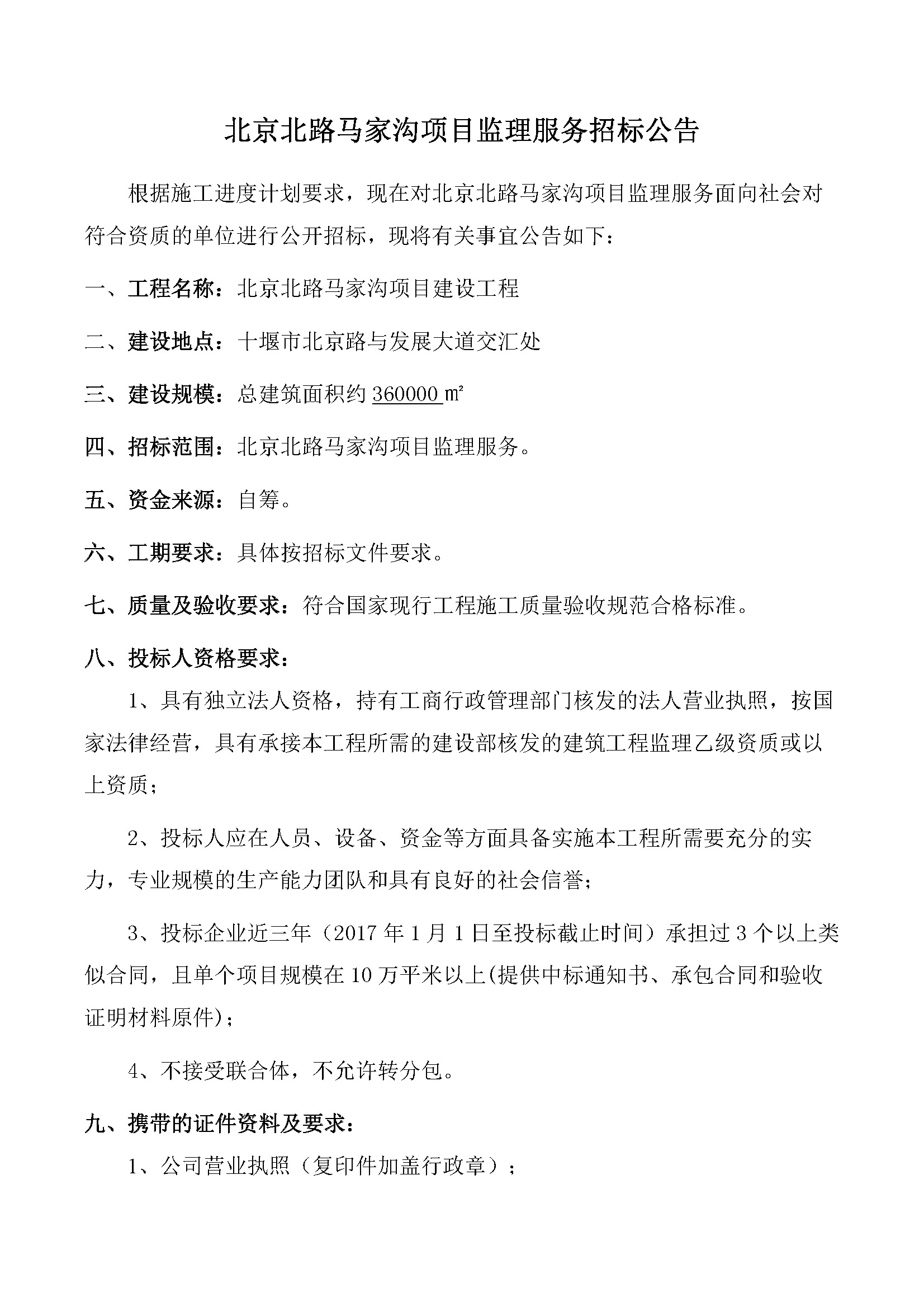 北京北路馬家溝項目監(jiān)理服務(wù)招標公告