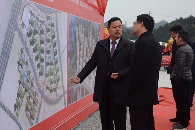 圖為集團(tuán)董事長劉金成向茅箭區(qū)委副書記趙洪福介紹項(xiàng)目情況