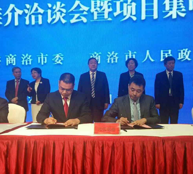 圖為丹鳳縣100MW“中國(guó)光伏幸福小鎮(zhèn)”項(xiàng)目簽約現(xiàn)場(chǎng)