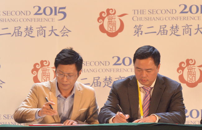 開幕式結束后,楚商大會重大項目簽約儀式舉行,集團董事長劉金成與浙江中國小商品城義烏購副總經理樓遠斌現場簽約。
