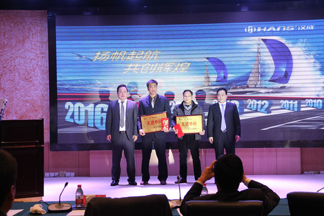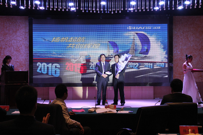 圖為劉剛副董事長和孫雄飛副總裁為先進(jìn)單位頒獎(jiǎng)