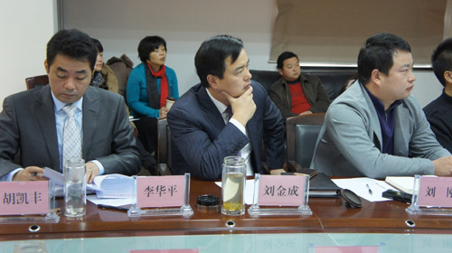 劉金成董事長(中)認真聽取工作匯報
