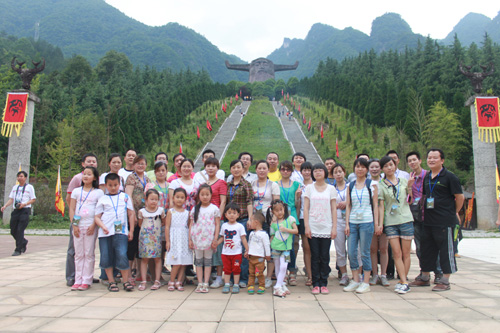 在神農(nóng)壇主體建筑——神農(nóng)巨型牛首人身雕像前合影