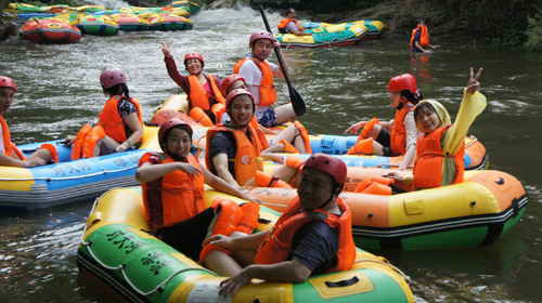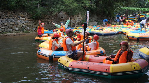 結束黃麻起義和鄂豫皖蘇區(qū)革命烈士陵園紅色主題教育活動后,團隊一行23人下午兩點來到了紅安縣對天河漂流景區(qū)探險漂流。紅安對天河探險漂流地處天臺山國家森林公園內(nèi),河道全長5.8公里,上下游落差143米,景區(qū)內(nèi)峽幽谷深、灘多浪急、古木參天、怪石林立、峭巖飛瀑、風光迷人。團員們每兩人一個小組自由組合,相互協(xié)作登上橡皮艇,奔流而下,一路搏急浪、滑奇石,沿途藤蔓錯雜、奇石飛瀑的叢林風光也讓大家大飽眼福。歡笑聲、驚呼聲、尖叫聲不絕于耳,氣氛熱鬧異常。