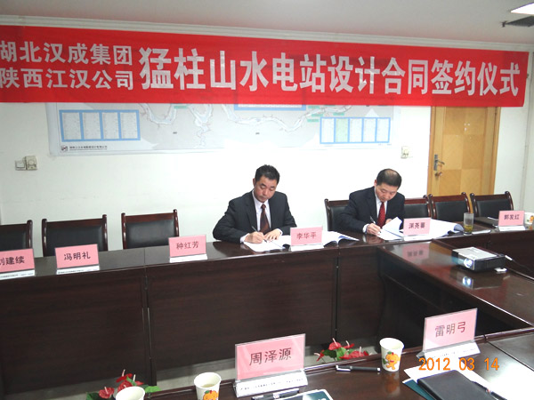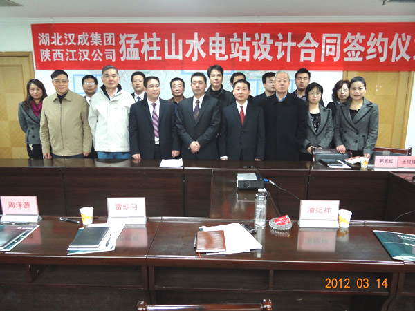 2012年3月14日,漢成集團(tuán)與陜西省江漢水利水電勘察設(shè)計(jì)研究院在該院會(huì)議室舉行了猛柱山水電站設(shè)計(jì)合同簽約儀式,根據(jù)合同,陜西省江漢水利水電勘察設(shè)計(jì)研究院將承擔(dān)漢成集團(tuán)猛柱山電站的設(shè)計(jì)工作。漢成集團(tuán)總裁李華平出席了簽約儀式。